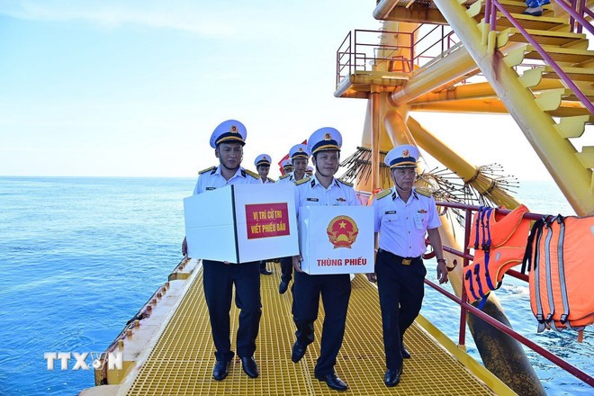 Tổ bầu cử mang thùng phiếu và vật tư trang bị lên nhà giàn DK1/9. (Ảnh: TTXVN phát)