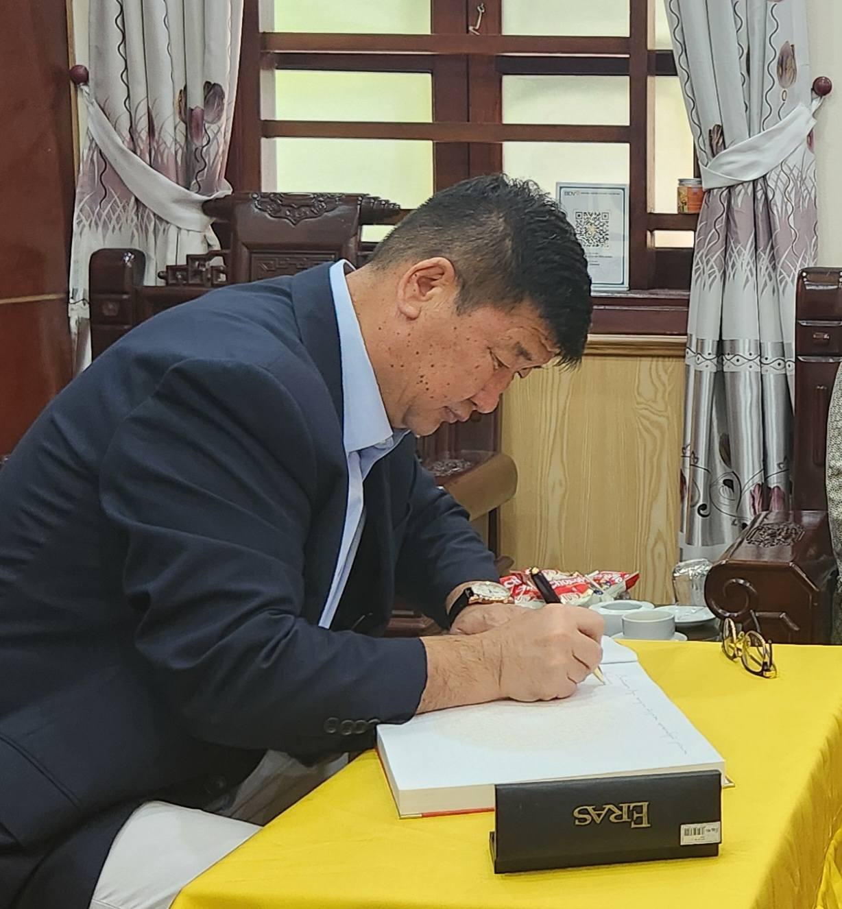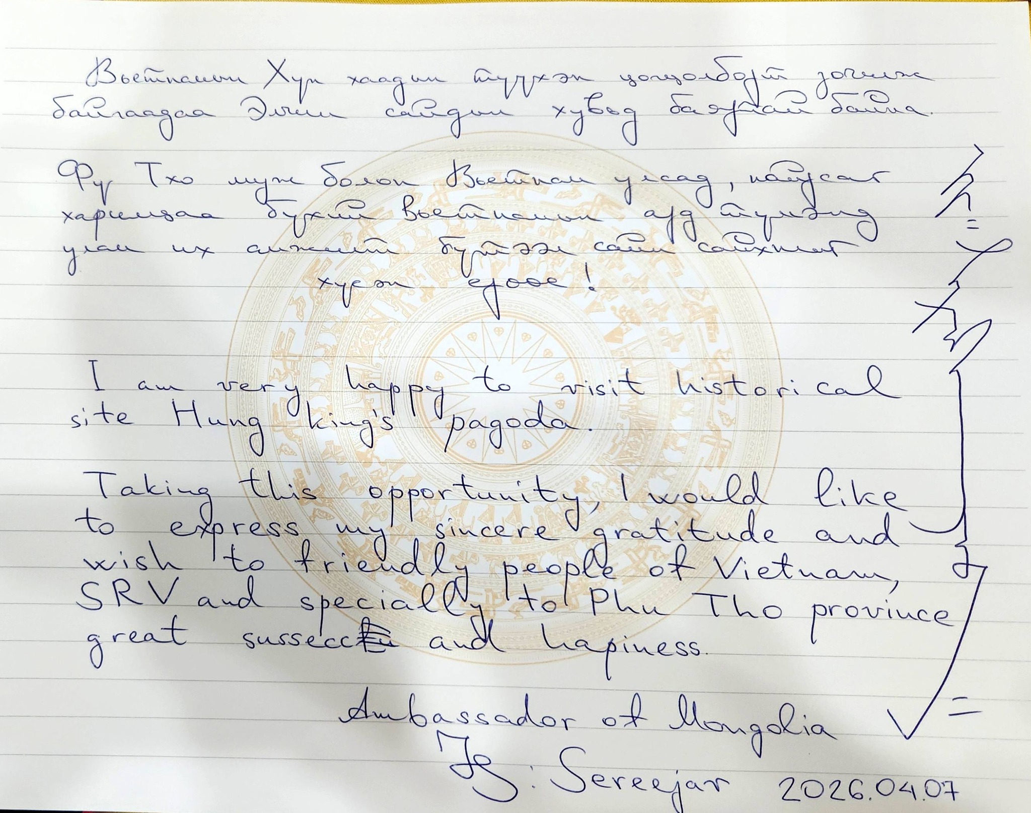 Hôm nay 7/4, Đại sứ Mông Cổ Jigjee Sereejav thăm Khu di tích lịch sử Đền Hùng, thắp hương tại đền thờ các vua Hùng và ghi sổ vàng lưu niệm: "I am very happy to visit historical site Hung Kings'. Taking this opportunity, I would like to express my sincere gratitude and wish to friendly people of Vietnam and specially to Phu Tho province great success and happiness". (tạm dịch: Tôi rất vui mừng được tham quan di tích lịch sử Hùng Vương. Nhân cơ hội này, tôi xin bày tỏ lòng biết ơn chân thành và chúc người dân Việt Nam thân thiện, đặc biệt là tỉnh Phú Thọ, nhiều thành công và hạnh phúc).